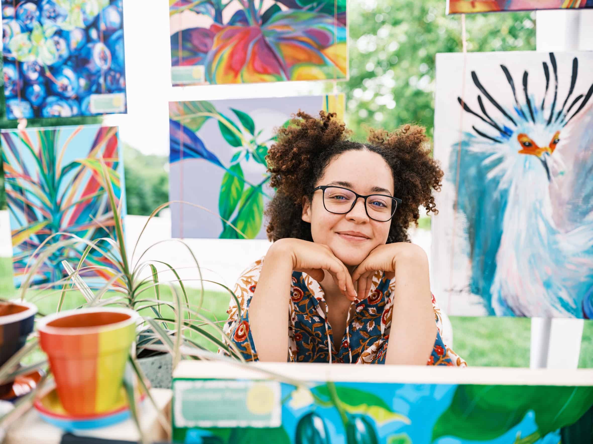 Young Latin woman artist selling her art at Outdoor Market. She is dressed in casual East Indian dress. Exterior of public park in downtown Toronto, Canada. © FOTOGRAFIA INC./ iStock