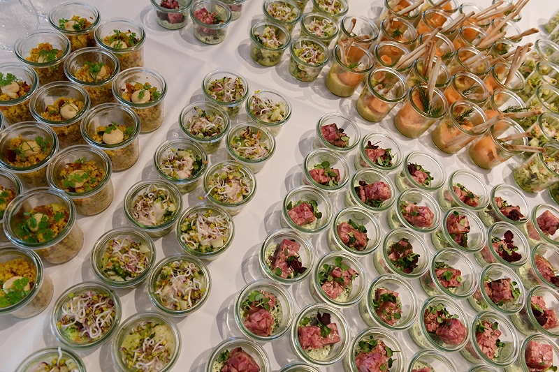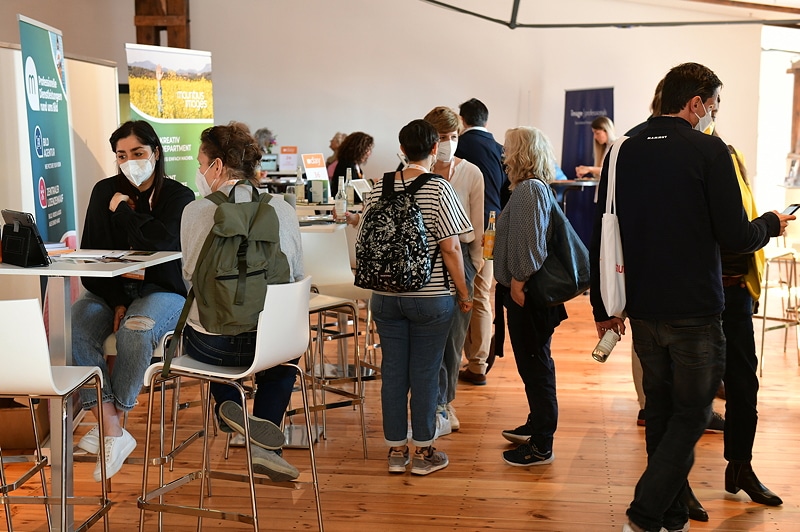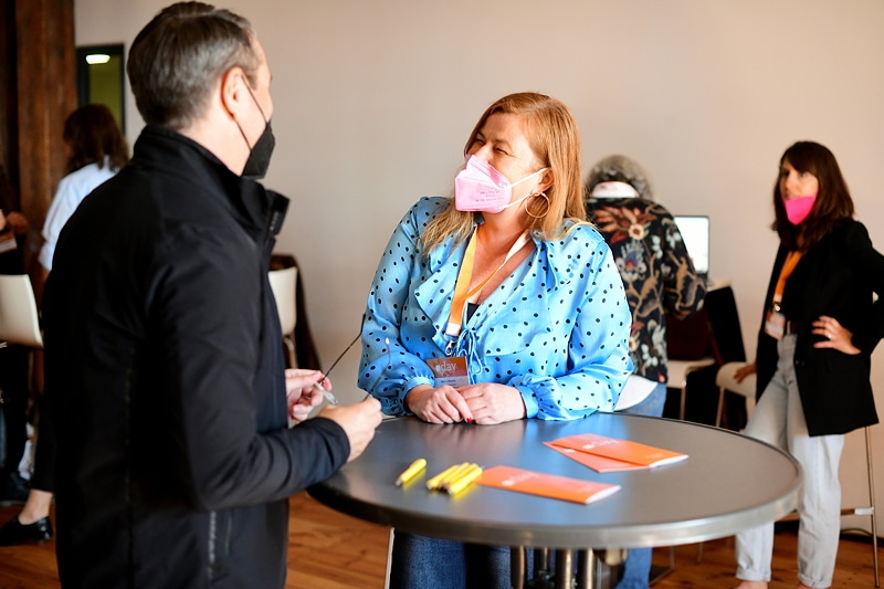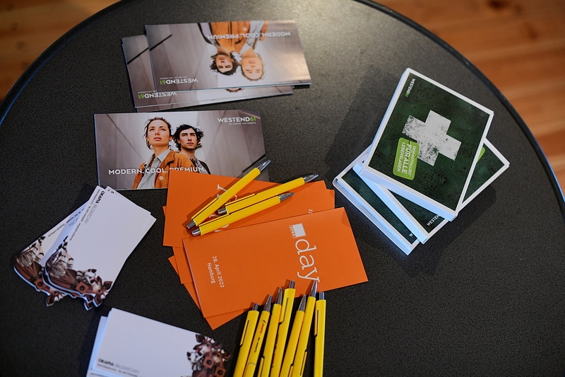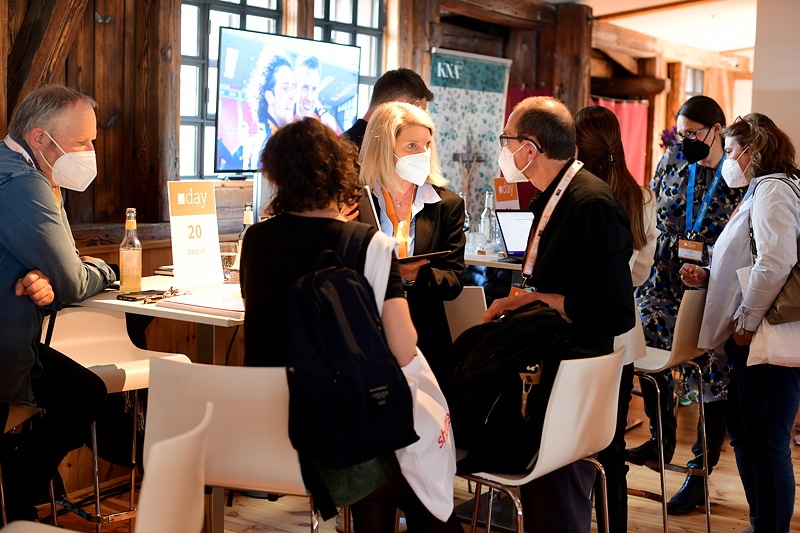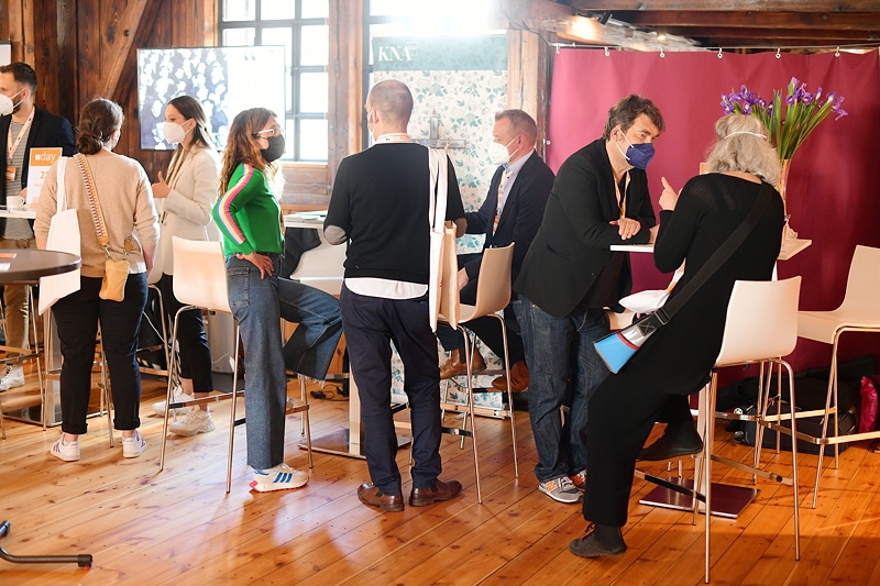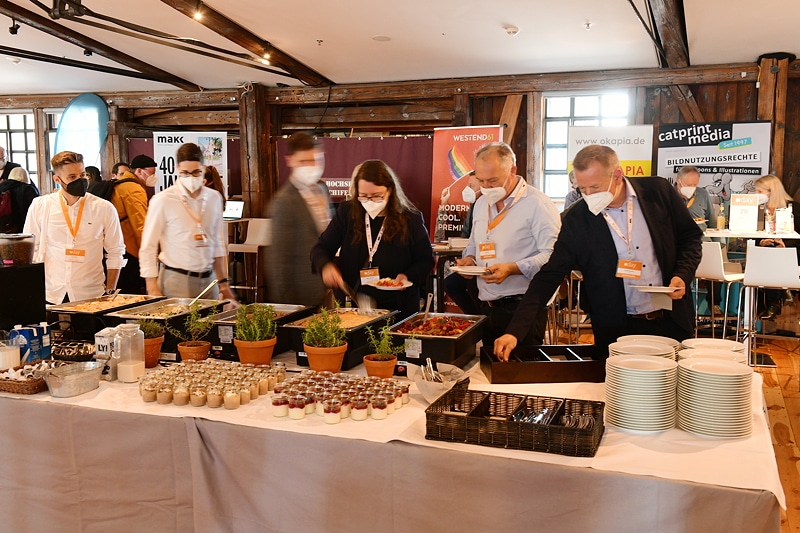 Die Freude darüber, sich nun endlich wieder persönlich austauschen zu können, war greifbar. Die helle Location mit ihrem hölzernen Gebälk und den beiden großräumigen Dachterrassen und einer beeindruckenden Aussicht bot optimale Voraussetzungen, um mit altbekannten Gefährt:innen zu plauschen und neue Kunden kennenzulernen. Nebenher genossen die Teilnehmer:innen das wechselnde Buffet und Getränke – denn gute Geschäfte gehen ja bekanntlich durch den Magen.